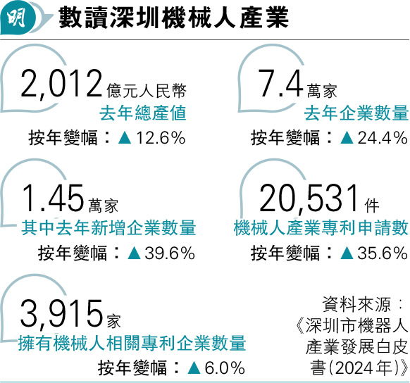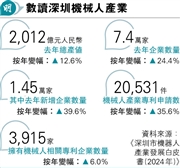 深圳的機械人產業為全國佼佼者。深圳市機器人協會與中國科學院深圳先進技術研究院年初的《深圳市機器人產業發展白皮書(2024年)》指出,全市機械人產業鏈總產值去年達2012億元人民幣,年增12.6%。今年7月底,龍崗區新開號稱全球首家的「機械人6S店」,集展示、銷售、租賃和定製等於一體,客人既可買整機或租機,亦可按自己需求「砌機」,為機械人進入百姓家踏出第一步。