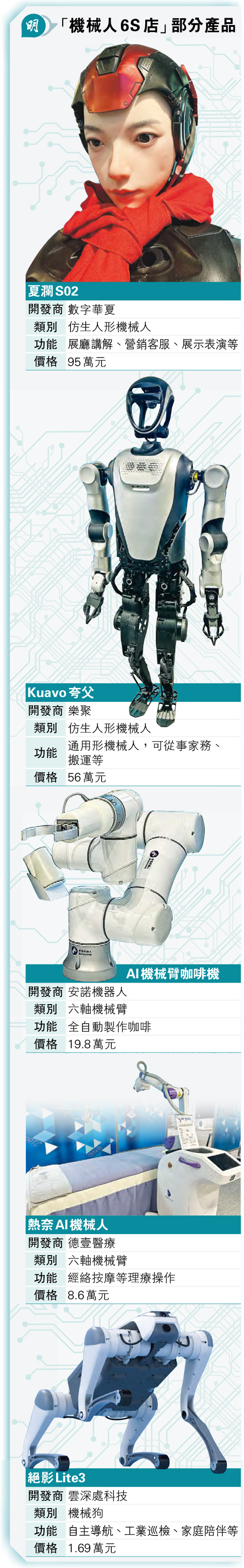 「機械人6S店」的「6S」,是在傳統汽車4S店銷售(Sale)、零配件供應(Sparepart)、售後服務(Service)及信息反饋(Survey)4項基礎上,新增租賃(Lease)和個性化(Customized)兩大功能。店長張帥表示,截至上月已有逾30家機械人企業簽約合作,其中人形機械人產品佔約20%,應用範圍涉及工商業和生活。