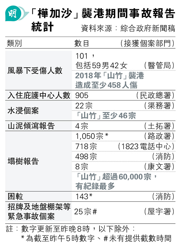 天文台於昨午1時20分改發8號東南烈風或暴風信號,於晚上8時20分改發3號強風信號。天文台昨發表《天氣隨筆》指出,「樺加沙」襲港期間多區水位較正常潮位高,其中維港水位昨早升至約3.4米,接近2017年「天鴿」襲港時水位。其強勁風力亦引發越堤浪,導致沿岸地區多處水浸,如沙田城門河及杏花h海旁等。