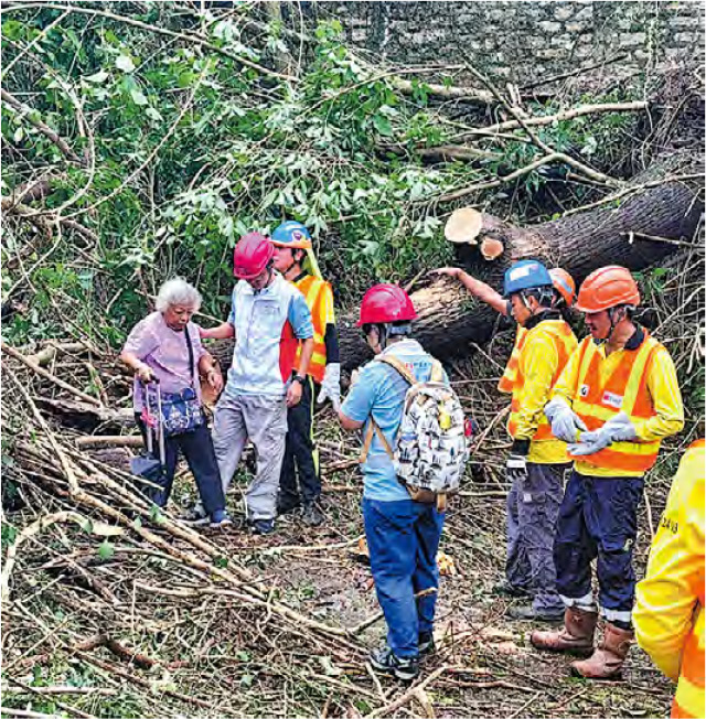 另外,打風期間本港錄得逾千宗塌樹報告,中國建築社區應急義工隊接獲沙田民政處求助,昨早往沙田火炭黃竹洋村徑清理塌樹。中國建築表示,該路段是黃竹洋村對外唯一通道,全村逾120名居民中近半為長者,義工隊昨召集近30名義工及調派4架吊機車、攜帶油鋸等到場清理,最後為兩名急需就醫的長者及4名學童開路。村長表示感謝義工隊解居民燃眉之急。