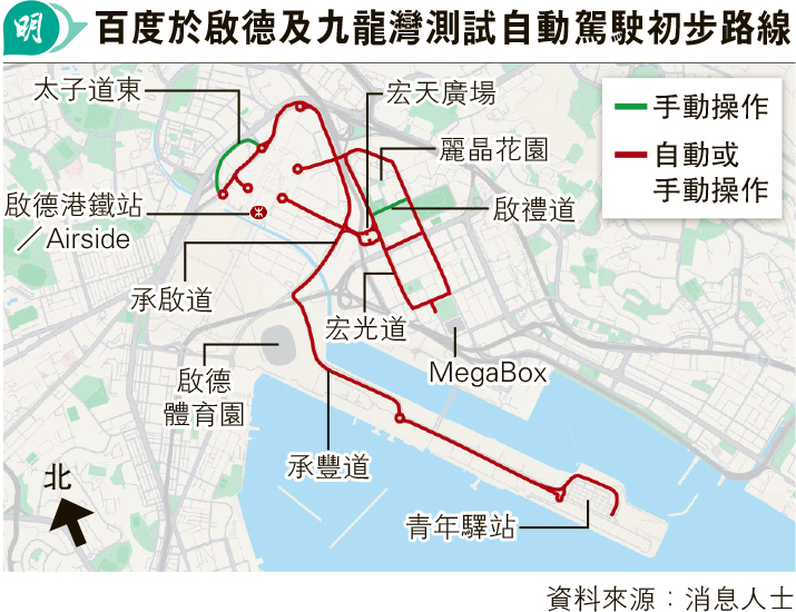 【明報專訊】《施政報告》提出政府今年批出3個區域讓自動駕駛車輛測試,運輸及物流局長陳美寶早前透露其中一個項目會橫跨九龍城及觀塘,涵蓋啟德發展區。據本報了解,百度已向當局申請在啟德及九龍灣一帶測試自動車,途經啟德郵輪碼頭附近青年驛站、AIRSIDE、麗晶花園外圍、九龍灣MegaBox對出零碳天地一帶(見圖),下周一及周二將諮詢觀塘及九龍城區議會。若獲區議會支持及運輸署審批,預計最快年底開始測試。