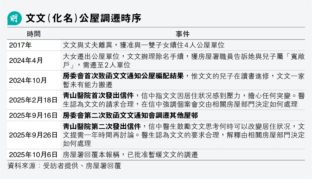 【明報專訊】本報9月初報道天水圍天恩h精神病患母子被收回公屋期間離世,特首李家超於同月16日表示要求房署考慮在處理特別個案,如何做到情理兼備。現接受青山醫院精神治療的公屋「寬敞戶」向本報表示,一年半內兩度接獲調遷通知。她向房署提交青山醫院醫生信證明自己因調遷感到壓力後,相隔約7個月,即今年9月中第二次獲房委會通知需調遷至細單位,事主再向房署呈交第二封醫生信求情。記者就個案向房署查詢後,房署日前回覆稱檢視個案的獨特情G後,已批准暫緩其調遷。