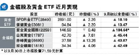 昨日港股金礦股繼續上升,赤峰黃金(6693)上升13.26%,山東黃金(1787)升7.61%,自9月初以來已累升逾四成,半新股紫金黃金國際(2259)微跌0.48%,不過以上月底上市招股價計算,已經上升1.04倍。美股金礦股亦表現強勢,市值最大金礦商ETF VanEck黃金礦業ETF(美:GDX),昨日開市上升2.22%報78.7美元,9月以來累升21.84%。