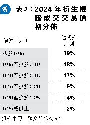 諮詢文件顯示,去年全年,其實有84%的衍生權證成交額,是以低於0.15元的價格成交。當中在0.15元以上則佔餘下16%成交,0.25元或以上成交僅佔3%(見表2)。港交所上市主管伍潔鏇表示:「隨茈奕儺藿狺峓賳磢抳搢D不斷演變,他們亦要致力確保結構性產品上市框架切合市場需要,並具備全球競爭力,相信今次諮詢提出的建議將促進產品創新、提升市場效率,同時維持市場質素及確保高水平的投資者保障。」