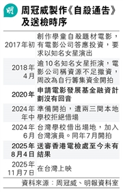 曾執導電影《十年》的導演周冠威,其講述學童自殺題材電影《自殺通告》下月在台灣公映,他提及製作過程屢碰壁,2017年初創作《自》曾獲大型電影公司全數投資,一年後對方稱「資金不足」撤資,團隊需集資開拍,2020年申請電影發展基金融資計劃亦沒有回音(見表)。他表示,去年向兩三間相熟本地中學借場取景遭拒,他擔心借到場亦難保拍攝順利,「會否拍了兩三日突然不借?那怎樣連戲呢?」他衡量投資風險後決定移師台灣拍攝,並轉用台灣演員。