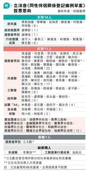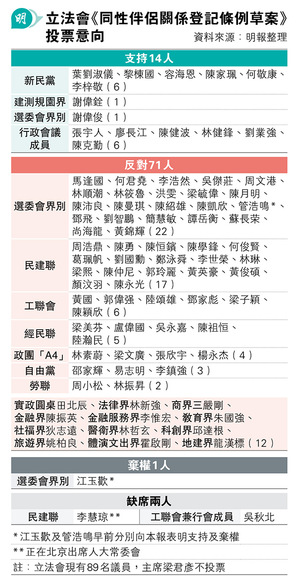 投下贊成票的14人,包括7名身兼行會成員的議員、新民黨成員、選委界謝偉俊及建測規園界謝偉銓,有議員則「轉恁v。曾表明贊成法案的選委界別江玉歡轉投棄權票,她發言時自言並非「騎牆」,認為支持與反對的社會基線仍移動,可留時間讓下一輪討論基礎更紮實。身兼社聯主席和牧師的選委界別議員管浩鳴曾表態棄權,昨轉投反對票,他向本報稱初時重點聆聽社福界意見,但考慮到宗教界的反對觀點後,決定投反對票以清晰表態。