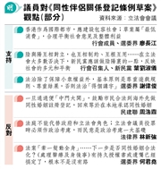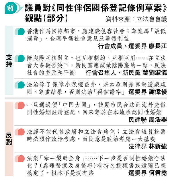 身兼行會成員的廖長江形容草案屬「最低消費」,合理平衡社會意見及整體利益,但引述意見憂引來同性伴侶收養權等「更激進」訴求,提醒性小眾群體「不要過分挑戰香港社會底線及主流價值觀」。謝偉銓、謝偉俊、新民黨容海恩及何敬康均強調贊成是出於尊重法治及終院判決。