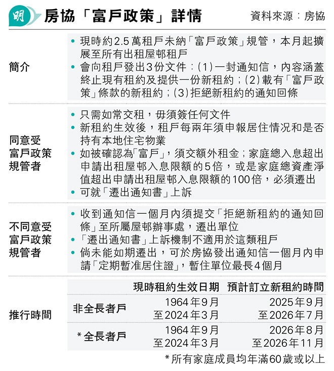 【明報專訊】房協本月起將約2.5萬戶出租屋h租戶納入「富戶政策」,須申報資產。房協下周一起會分批寄出新租約及文件,預計最快於2028年4月首次申報資產,若屬「富戶」則最早由2029年4月起交額外租金,大幅超額者須遷出;不同意者則須提交回條及遷出。房協正研究方案,讓主動交回單位的「富戶」保留綠表資格4年,協助富戶轉購居屋等資助出售房屋,預計有關檢討本年度內完成。