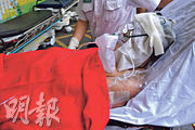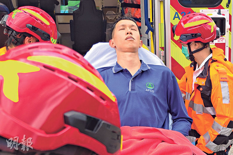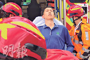 其中一名男船員腳部受傷,清醒由救護車送往將軍澳醫院治理。(林智傑攝)