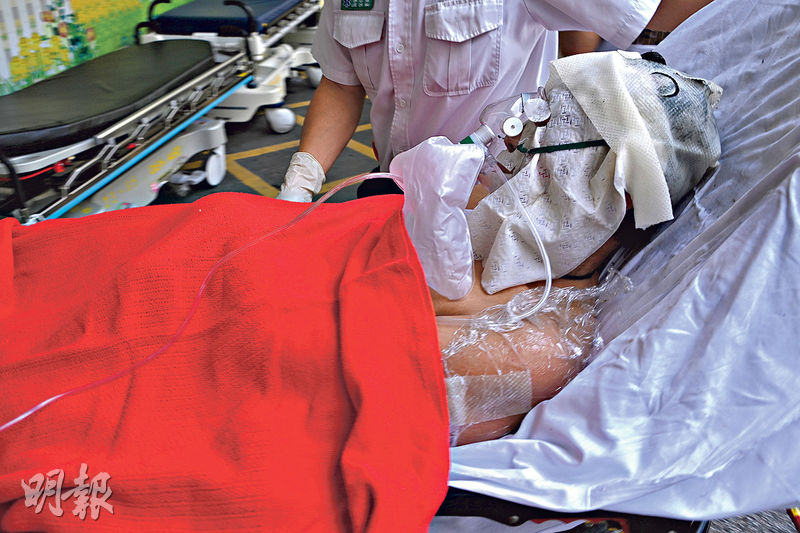 男船長臉部及手部燒傷,需以敷料及保鮮紙敷治,並戴上氧氣罩,清醒由救護車送院。(孫華中攝)