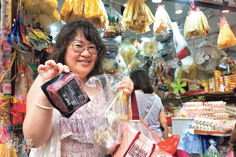 市民張太(圖)昨到鵝頸橋露天街市買R,她說擔心今日會有強風暴雨,未能出門,並聽聞「樺加沙」威力能與「天鴿」和「山竹」匹敵,故昨日所買R菜分量較平日多,共花費約400至500元。(廖凱霖攝)