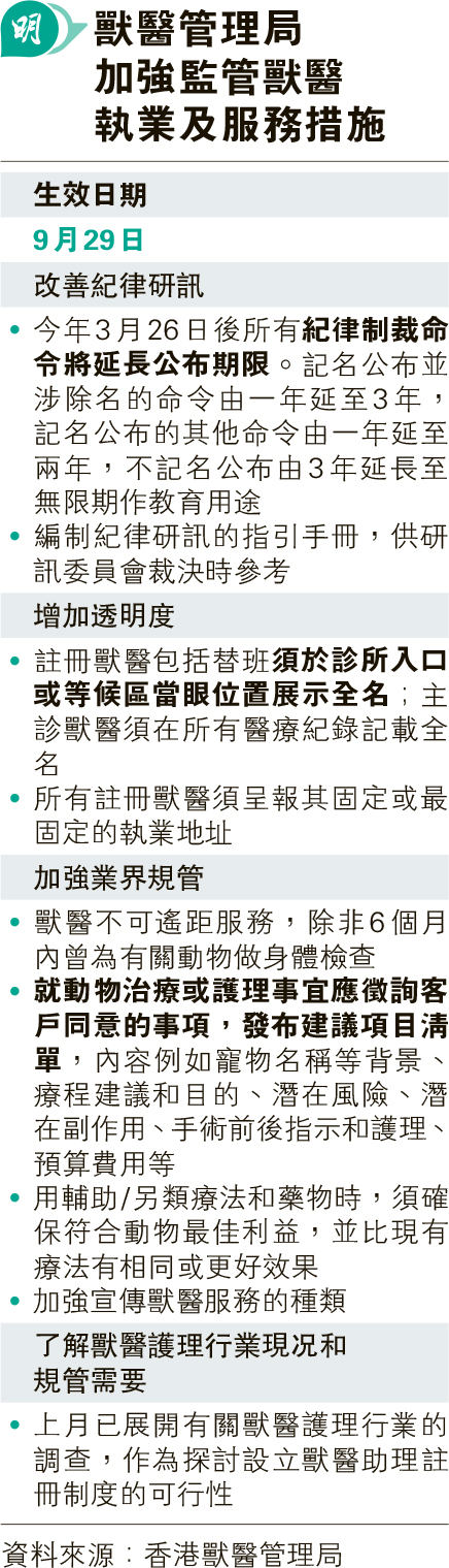 獸醫管理局昨提出9項加強監管指施(見表)。增加透明度方面,局方稱會延長紀律制裁命令的發布期,涉及獸醫除名的裁決會延長至刊登3年、其他「開名」的紀律裁決延長至兩年;不記名裁決由刊登3年延長至無限期作教育用途,適用於今年3月26日後裁決。局方亦要求替班在內的獸醫須在執業診所入口或等候區當眼位置展示全名;主診獸醫須在所有診症和護理程序的醫療紀錄載列全名;局方又會編制紀律研訊及裁決指引供研訊委員會參考。