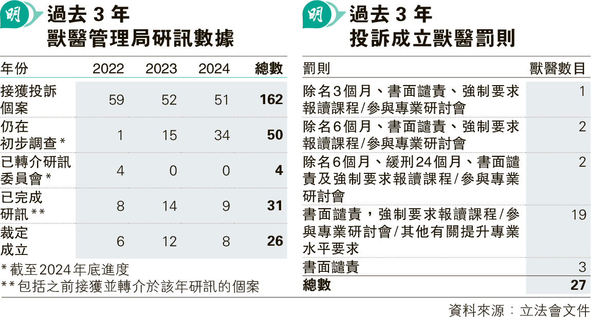 翻查資料,過去3年局方累計收到162宗投訴,同期有31宗個案完成研訊,大部分均是3年前接獲的轉介,當中26宗成立,大部分獸醫被書面譴責及要求上課程。