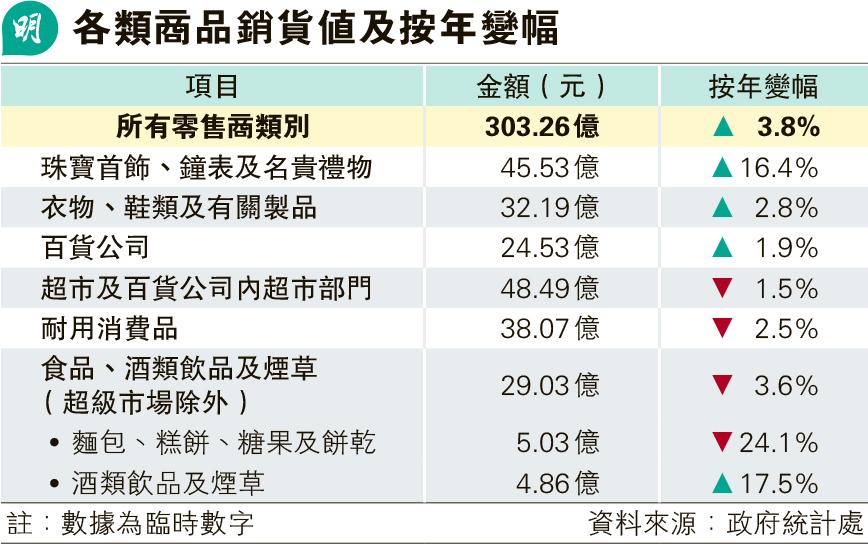 【明報專訊】政府統計處昨日公布,本港8月零售銷售額按年增3.8%,好過市場預期的增長2%,連升4個月,升幅為2023年12月後新高;銷貨值錄得303.26億元,為今年第三高月份。各類商品中,珠寶首飾銷貨值按年勁升16.4%最搶鏡。香港零售管理協會主席謝邱安儀稱,零售業已進入較平穩狀態,普遍對國慶黃金周「信心不錯」,超過八成協會會員預計期內銷貨額將至少持平或有單位數以致低雙位數上升,整體審慎樂觀。