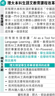 現時理大本科生須在中、英語文教學中心修讀共3個語文科目,以完成大學核心課程的「語文及溝通課程(LCR)」方能畢業。談到推動數位轉型的改革措施,曹建農表示,當AI出現後,學習語言變得便利,因此校方盼從語言教育茪漶A改革LCR要求。他透露校方安排AI專家及教學中心的語文專家,正籌備所有新生均須修讀的「AI as a Tool for Language Learning」課程,其間教授如何使用AI工具學習語言等知識,加強學生讀寫及面試等能力(見表)。