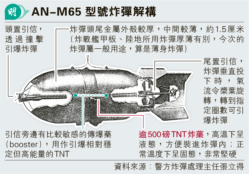 【明報專訊】o魚涌濱海街與英皇道交界地盤前日發現1000磅重炸彈,警方確認屬二戰時美軍空投炸彈,內含逾500磅TNT炸藥,需疏散約6000人。經過約9小時,警方昨中午前完成拆彈,重開封閉道路,居民陸續返回住所。警方爆炸品處理課(EOD)炸彈處理主任警司張立得昨接受本報專訪講解「拆彈」任務詳情,解釋香港地盤條件獨特,今次首次將炸彈開口切成長方形而非慣常的圓形,務求取得更佳效果。