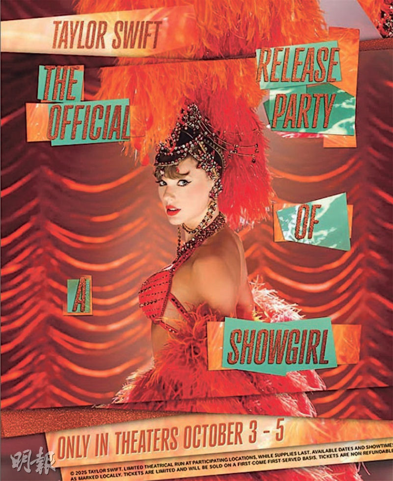 另一方面,Taylor Swift為配合下月3日推出的全新專輯《The Life of a Showgirl》,將於當日至10月5日在北美、英國、法國、芬蘭、澳紐等國家及地區戲院放映新片《Taylor Swift: The Official Release Party of a Showgirl》,收錄主打歌《The Fate of Ophelia》MV和製作花絮,以及新碟其他作品的歌詞版MV等,預計在北美將迎戰同期開畫的《狂野時速》狄維莊遜(Dwayne Johnson)主演參賽威尼斯影展新片《The Smashing Machine》,以及《阿凡達:水之道》重映版。據美媒報道,Taylor新片上周五預售門票,首24小時進帳1500萬美元,按此推測首周末票房可見3000萬至5000萬美元。美媒引述消息人士透露,這次Taylor方面直接與AMC院線的行政總裁Adam Aron安排新片上映事宜。事實上,她的演唱會紀錄片《Eras Tour》美國票房1.8億美元,全球收2.6億美元,盈利超過1.7億美元,今次新片也由Taylor方面主導,避開傳統電影公司分成模式。