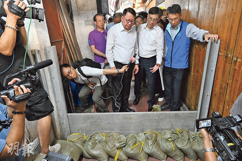 領導應對極端天氣督導委員會的政務司長陳國基昨午聯同多名官員落區,包括到水浸高危點之一鯉魚門視察防風措施。他說昨視察沙田一條靠近城門河的行人隧道,估計若降暴雨,一兩分鐘便足以淹沒該隧道;他稱路政署已於16條類似行人隧道安裝探測器,可24小時監測隧道內情G,8號風球懸掛的數小時內,政府會提早關閉類似隧道,並派駐警員監察。