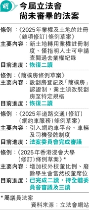 今屆會期10月24日結束,撇除國慶假期、10月8至10日的《施政報告》致謝議案辯論,實際上只餘3次大會。而據立法會資料,仍有3項已刊憲的政府法案、一項議員法案未完成審議(見表),網約車規管主體法例草案則剛完成法案委員會審議階段。