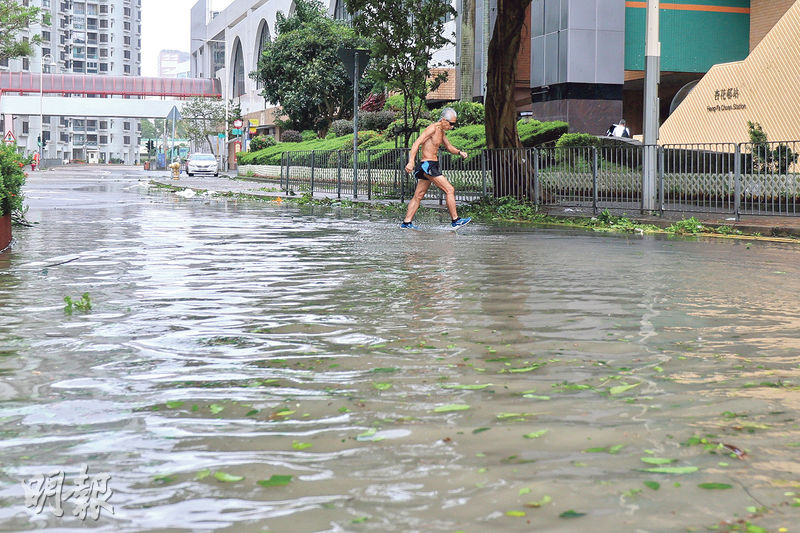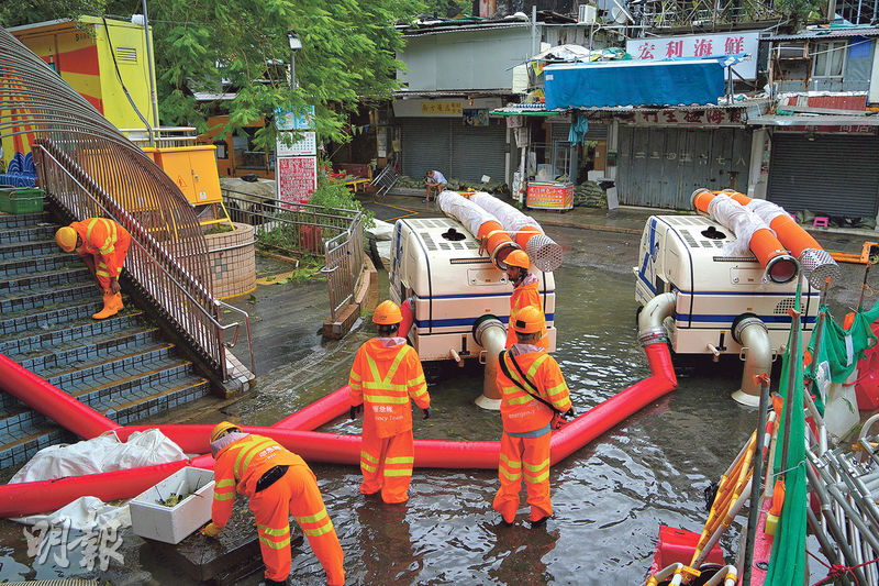截至昨晚8時政府共確認22宗水浸,當中大部分是日前政府評估在風暴期間會嚴重水浸的地點,包括大澳、嘉和里及鯉魚門等,但不少未被納入名單的地點亦現水浸,包括屯門龍鼓灘路、沙頭角中英街等。
