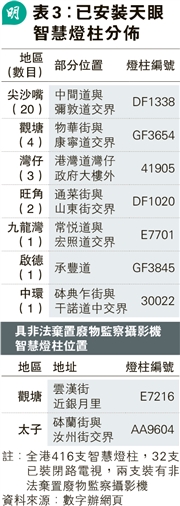 根據開放數據平台的「多功能智慧燈柱的功能總覽」,去年3月30日前未有智慧燈柱安裝天眼,至5月1日顯示旺角通菜街的智慧燈柱已安裝首部天眼,至去年底共26支智慧燈柱裝有天眼,至本月初增至32支。