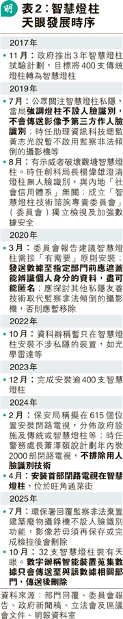 智慧燈柱蒐集數據曾惹爭議(見表2),政府曾強調不設人臉識別、不會傳送影像予第三方做人臉識別。2019年政府成立委員會檢視智慧燈柱的私隱問題,翌年提交報告建議政府需嚴按「有需要」原則安裝個別燈柱的裝置,設計上要預設保障私隱,發送數據至指定部門前應過濾和遮蓋足以辨識個人身分的資料,盡可能匿名。