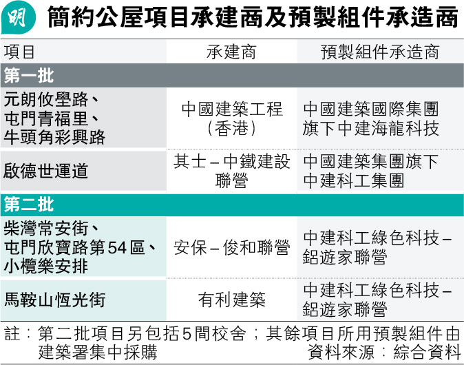 翻查資料,有別於首批簡約公屋所用的MiC預製組件分別由中建海龍科技及中建科工集團承造,第二批項目包括上述3個項目及馬鞍山項目所用組件,均由建築署集中採購,由「中建科工綠色科技-鋁遊家聯營」承造(見表)。