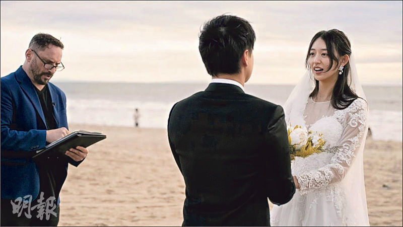 證婚人(左)到場,方力申(中)與葉萱(右)換上禮服及婚紗即場註冊結婚。(網上圖片)