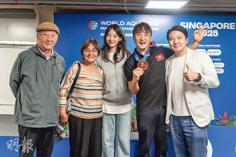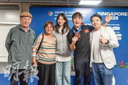 方力申(右二)早前在新加坡舉行的世界先進游泳錦標賽奪3枚金獎,跟父母(左一、左二)、太太葉萱(中)及弟弟(右一)分享喜悅。(資料圖片)