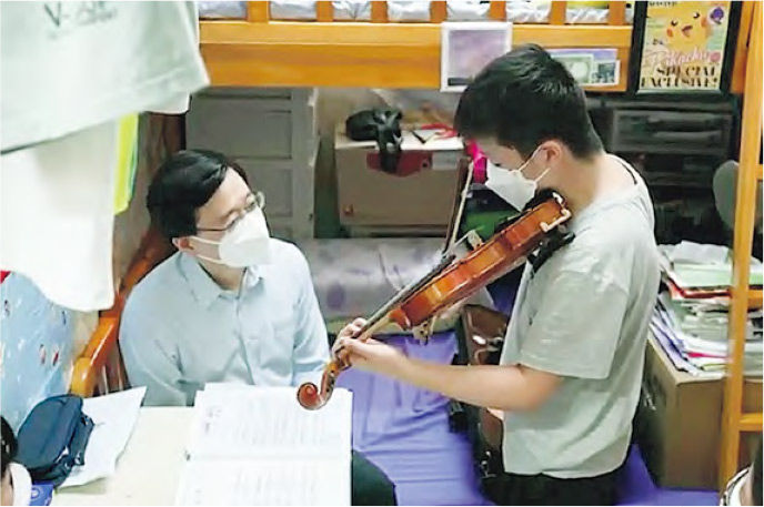 李家超(左)上任特首後,於2022年7月30日到深水麙斑X居於茤衁漣鼮t甫(右),李即席演奏小提琴。(李家超fb影片截圖)