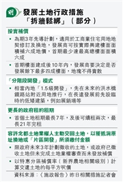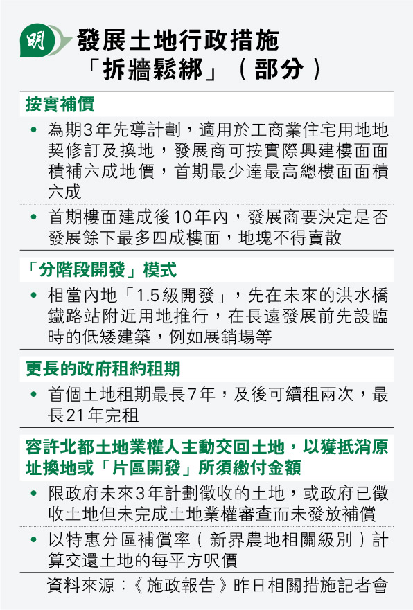 另外,施政報告就土地發展提出多項簡化行政程序以拆牆鬆綁(見表),包括提出「分階段開發」模式。甯解釋,做法似內地的「1.5級開發」,在香港屬新舉措,新發展區由開始做工程到成為成熟的發展區「可以是10年光景」,企業未必想一步到位興建永久設施,故構思政府選合適的產業或商業用地,短時間先做一些臨時、低矮的構築物,例如展銷場、會展設施。