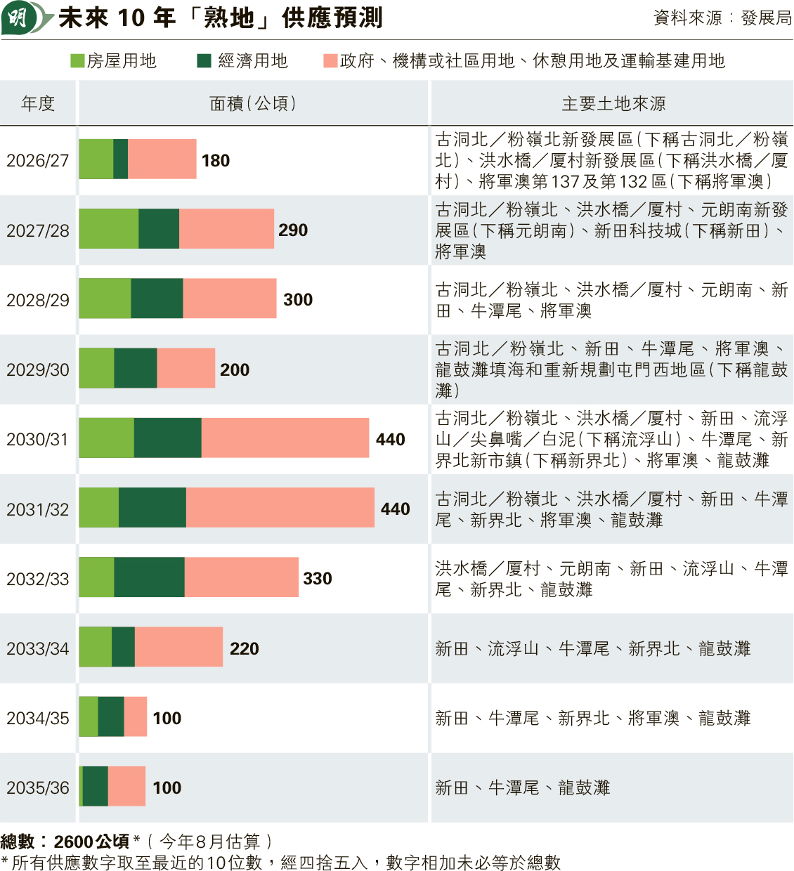 房屋供應方面,發展局預計2600公頃熟地中的房屋用地,可支持興建40多萬個房屋單位。發展局昨亦公布10年期的後5年期,即2031/32至2035/36年度落成公營房屋造地情G,預計建屋量為22.23萬伙,較去年公布後5年期(2030/31至2034/35年度)的24.34萬伙少8.7%。本報亦發現,部分用地可供發展年度較去年公布的延遲,如粉嶺第17區由2028/29年度可供發展變為「待定」。