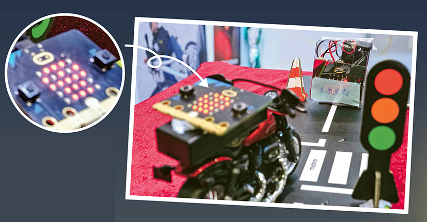 電單車駛近交通黑點時,衛衣上的Microbit便會亮起「骷髏頭」圖案(圓圖)提醒司機,以免發生意外。(馮凱鍵攝)