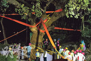 【明報專訊】超強颱風「樺加沙」上周吹襲香港後多區現塌樹,九龍公園一棵樹齡逾110年的大葉合歡(LCSD YTM/70)亦不敵強風傾倒。文體旅局其後委託「中國建築」搶救,中建義工隊昨日利用巨型吊機吊起樹幹,每次吊高10至15度便要暫停工序,調整古樹綑綁帆布繩的受力位,確保不會因受力不均或集中受力而折斷,歷時5.5小時「扶正」樹幹(圖)。該大葉合歡樹在1970年九龍公園建成時,已植根於1米多高的「泥膽花盆」,2004年納入香港「古樹名木」名冊,至上周遭颱風吹倒。
