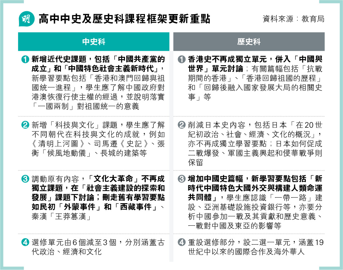 ¡i©ú³ø±M°T¡j·s¤@¥÷¡m¬I¬F³ø§i¡n´£¥X¡uÀu¤Æ°ª¤¤¤¤¥v©M¾ú¥v¬ì½Òµ{®Ø¬[¡v¡A±Ð¨|§½¬Q¤é¤½¥¬®Ø¬[½Õ¾ã¡A³¡¤À¤º®e±N½Õ°Ê§R´î¡A¦p¡u¤å²¡v¤£¦A¬O¤¤¥v¬ì¿W¥ß½ÒÃD¡B»´ä¥v¥ç¤£¦A¦b¾ú¥v¬ì¿W¥ß¦¨³¹¡C¦P®É¡A¨â¬ì¦P¼W¤¤°êªñ¥N¥v½g´T¡A¤¤¥v¬ì·s¼W¡u¤¤°ê¦@²£ÄÒªº¦¨¥ß¡v©M¡u¤¤°ê¯S¦âªÀ·|¥D¸q·s®É¥N¡v½ÒÃD¡A¾ú¥v¬ì¥[¤J¡u·s®É¥N¤¤°ê¯S¦â¤j°ê¥~¥æ¡v§@¾Ç²ßnÂI¡C±Ð¨|§½ºÙ¡uÀu¤Æ¡v¬OÅý½Òµ{¡u»P®É¨Ã¶i¡v¡B°ö¾i¾Ç¥Í¨ã³Æ·R°êºë¯«¡C·s®Ø¬[ÀÀ©ó2027/28¾Ç¦~¦b¤¤¥|¯Å±À¦æ¡A2030¦~°_¤¤¾Ç¤å¾Ì¸Õ¾A¥Î¡C