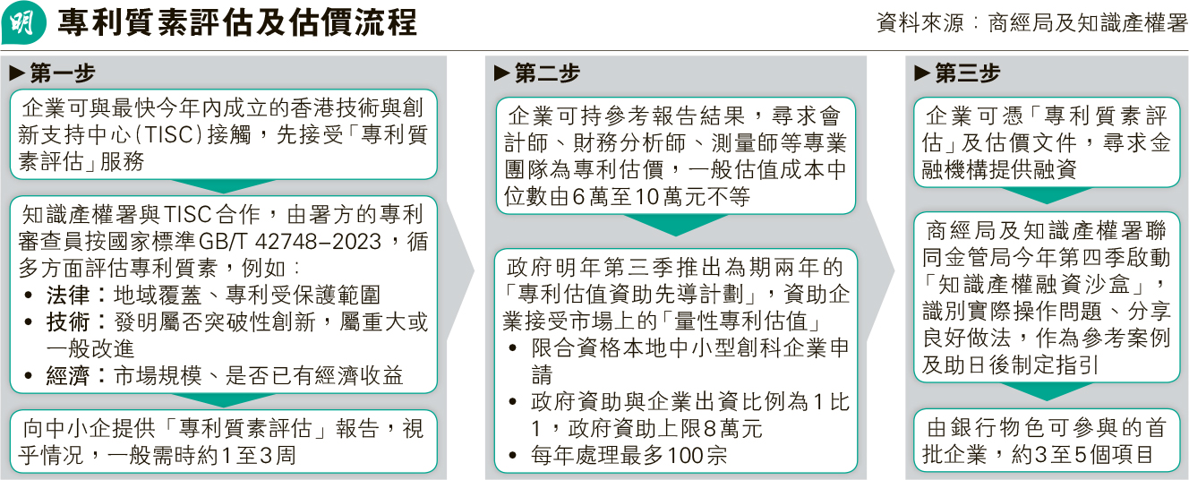 要憑知識產權融資,企業要先掌握專利的質素及估值。知識產權署將聯同最快今年底正式運作的香港技術與創新支持中心(TISC)合作,由署方的專利審查員,按國家2023年擬定的標準,為中小型科企循法律、經濟及技術層面,提供專利質素評估報告。林解釋,香港有不少專利申請人亦會在內地申請專利,在香港研發、內地生產,認為用國標評定可讓企業所得報告放於內地亦有參考價值。