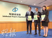 商經局副秘書長林兆康(左起)、知識產權署長黃福來和高級專利審查主任葉婉儀昨出席傳媒茶敘,介紹《施政報告》推動知識產權融資的措施,明年起政府會為業界提供專利質素評估服務,並資助合資格企業做專利估值。(鄭律銘攝)