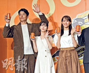 【明報專訊】《孤獨死又怎樣》綾瀨遙、《哥斯拉-1.0》濱邊美波、《城巿獵人》鈴木亮平及3人樂隊Mrs. GREEN APPLE昨現身東京啤酒代言活動,會上首播6人演出的全新廣告。這廣告約200人參與拍攝,講述Mrs. GREEN APPLE帶頭演奏歌曲,綾瀨遙等人享受美酒與音樂。綾瀨遙表示拍攝過程很開心,「我們一起唱歌飲啤酒,就像在看演唱會一樣」。她透露廣告畫面天朗氣清,其實拍攝當日天氣不穩定。鈴木亮平解釋,「當日時晴時雨,中途暫停拍攝近一小時,心想太陽快要下山了,幸好後來雨過天晴,順利完成拍攝。」