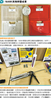 目前NAMI在衣、食、住、行、電子數個範疇已有研發成果。「譬如斥菌塑膠技術就運用在水樽堶情A我們的合作伙伴已將產品商業化,在坊間已經有售。在建造業方面,我們還與政府合作推動自壓實回填材料的應用。」沈文龍表示,「很多時候道路的建設和維修對市民出行造成不便。與傳統回填材料不同,NAMI的回填材料能連續灌注到溝槽中,毋須將土壤逐層壓實,且回填材料流動性高,容易填補空間,大大縮短工程時間。」