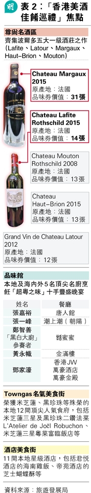 ¡u´L©|¦W°s°Ï¡v¤Î¡u«~¨ýÀ]¡v¬°¬Ì«áº¦¸«²{(ªí2)¡C³X«È¦p«DÁʶR¡u´L©|«~°sÃÒ¡v¡A¶·¥tÁʤJ³õ¨é¶i¤J´L©|¦W°s°Ï¡A¸Ó°Ïºôù¦U°ê³»¯Å¦WÆC¡A¥]¬A¥Ñ°ê»ÚÅv«Â°sµû®aJames Suckling¬D¿ïªº¸²µå°s¡A¥H¤Îªiº¸¦h¤¤j¤@¯Å°s²øLafite¡BLatour¡BMargaux¡BHaut-Brion¤ÎMoutonªº¨ÎÆC¡A»««È¥i¥Î12¦Ü31±i¤£µ¥ªº«~¨ý¨é«~¹Á¤¤j¦WÆC¡C«~¨ýÀ]«hÁܽХ»¦a¤Î®ü¤º¥~¦@5¦W¼p¡A¬¶»s¡u¶W¸f¤§¨ý¡v¤Q¤â±ß®b¡C