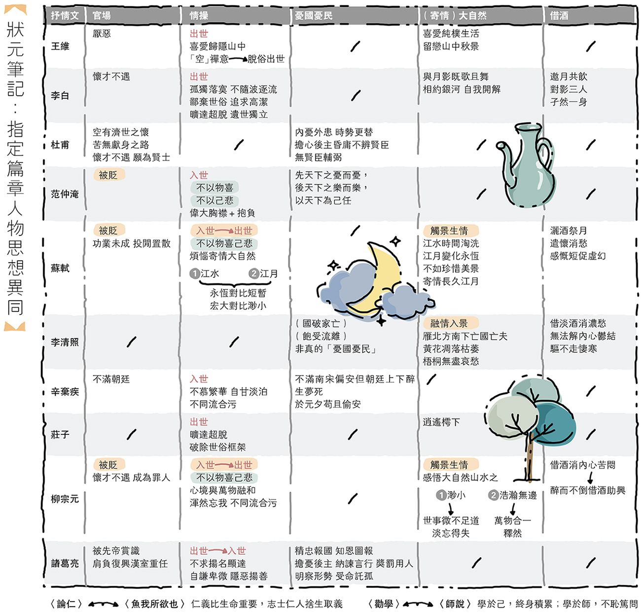 邱博恩整理了指定篇章人物思想異同,狀元筆記見圖。