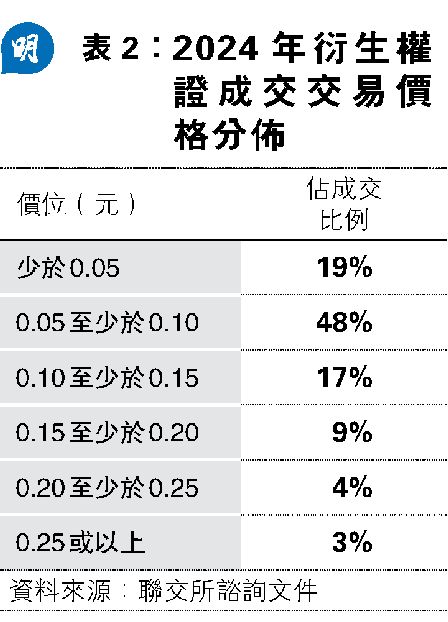 諮詢文件顯示,去年全年,其實有84%的衍生權證成交額,是以低於0.15元的價格成交。當中在0.15元以上則佔餘下16%成交,0.25元或以上成交僅佔3%(見表2)。港交所上市主管伍潔鏇表示:「隨茈奕儺藿狺峓賳磢抳搢D不斷演變,他們亦要致力確保結構性產品上市框架切合市場需要,並具備全球競爭力,相信今次諮詢提出的建議將促進產品創新、提升市場效率,同時維持市場質素及確保高水平的投資者保障。」