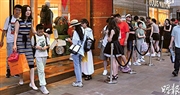 昨日國慶黃金周第二日,本地某知名金舖旺場,顧客需排隊入內選購首飾。由於金價較去年同期勁升逾三成,帶動8月珠寶首飾、鐘表及名貴禮物的銷貨價值按年升16.4%至45.53億元。(鍾林枝攝)