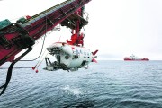 「蛟龍」號被母船吊起回收。為了這次北極任務,「蛟龍」進行抗寒改造並添加導航、定位設備。(新華社)