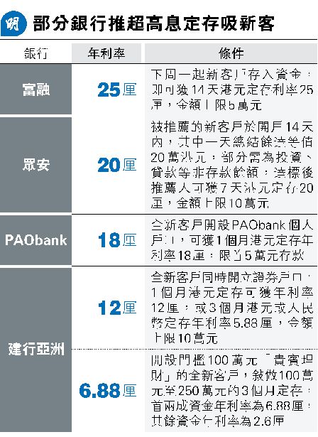 ¬ü°ê¤W¤ë«±Ò´î®§¡A´ä¤¸©w¦s§Q²v¨«¶Õ®ÆÄò¤U¦æ¡A¿n·¥§l¯Ç·s«Èªº¼Æ¦r»È¦æ¡Aªñ´Á¥H¶W°ª®§´ä¤¸©w¦s§Q²v¬°¾»ÀY§l¤Þ·s«È¡C¥ÑÄ˰T(0700)±±¨îªº´I¿Ä»È¦æ¤½¥¬¡A·s«È¤á¦s¤J·s¸êª÷¡A¥i©ó¤U©P¤@(6¤é)¥H25Íù¦~§Q²v¶}¥ß14¤Ñ´ä¤¸©w¦s¡Aª÷ÃB5¸U¤¸¡A´Á¤ºÀò§Q®§479¤¸¡C¶Ç²Î»È¦æ¤è±¡A«Ø¦æ¨È¬w²z°]¤á¤f·s«È¤á°µ3Ó¤ë©w¦s¡Aº¨â¦¨¸êª÷¥i¨É¦³6.88Íù¡A¨ä¾l¸êª÷¥ç¥i¨É2.6Íù¡A¥H¤W250¸U¤¸pºâ§Y¥i¦¬®§2.16¸U¤¸¡A¬Û·í©ó3.46Íù¡C
