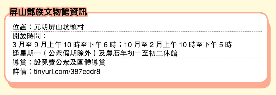 介紹屏山鄧族的歷史、風俗及文化生活,並展示村民提供的珍貴文物