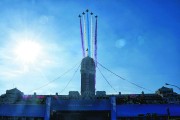 【明報專訊】台灣雙十慶典昨日預演,主持人開場時祈願花蓮災民盡速重建家園,壓軸由空軍雷虎小組「勇鷹」高教機五機編隊噴彩煙飛越台北總統府上方,這是雷虎小組換裝勇鷹高教機後首度在雙十大會預演亮相,現場民眾連聲歡呼。
