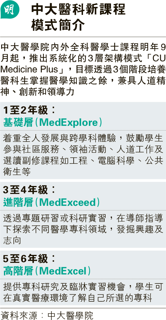 【明報專訊】中大醫科下學年(2026/27)起將採用新課程模式「CU Medicine Plus」,希望醫科生兼具創科精神、領導力和人文關懷。新模式引入3層架構,將課程分為3個階段,首階段茩咱人發展,鼓勵學生選讀副修、參與社區服務等。中大醫學院院長趙偉仁說,隨茪H口老化、人工智能(AI)應用等趨勢冒起,好醫生不但需要知識,亦要有同理心、認識創科等。