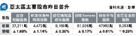 其他亞太區主要股市方面,台灣加權指數昨日亦升近2%或450.89點,收報27,211點創歷史收市高位,更曾一度高見27,301點。新加坡海峽時報指數升1%或50.55點,收市報4472點。澳洲悉尼普通股指數則跌近0.3%或26.4點,收市報9253.6點。