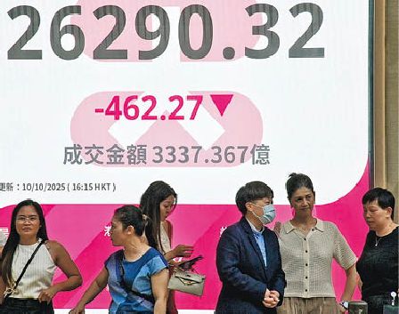 中美角力升溫打擊市場情緒,加上美匯指數周四升破99後續企高位,港股踏入10月除首個交易日報升外,已連跌5日,累跌997點或3.65%。早前熱炒的AI概念股和金礦股大跌,資金換馬至電訊及內地保險股避險。重磅科技股向下拖累瓻最多跌505點,收報26,290點,跌462點或1.73%,失守10天及20天線。證券界人士預期,中美首腦在月底可能會面之前局勢仍不明朗,科技股續調整,瓻或於25,800點有較大支持。至昨晚深夜,美國總統特朗普稱「沒理由」跟國家主席習近平見面,並聲稱或會向中國貨品加徵大額關稅,瓻夜期至11時半跌逾500點。明報記者